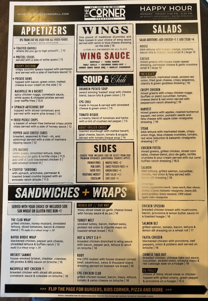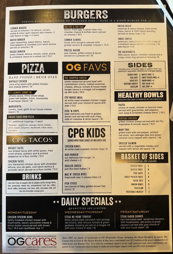 Introducing The Corner Pub and Grill, a pub specializing in American cuisine, located at 13645 Big Bend Rd Ste 105 Valley Park, MO 63122. This establishment offers an array of amenities, including takeout, reservations, vegetarian options, and catering services. The menu features tempting appetizers like Toasted Ravioli, Cauliflower Parmesan Bites, and Potato Skins. The salads are fresh and flavorful, with options like the Corner House Salad and Cobb Salad. Soups like the Drunken Potato Soup and Mind Blowing Chili are sure to warm you up. Customers have praised the friendly service, gluten-free options, and affordable prices. The outdoor seating and spacious interior make it a great spot for gatherings. Whether you're looking for a casual lunch or a fun night out, The Corner Pub and Grill offers a diverse menu and welcoming atmosphere.